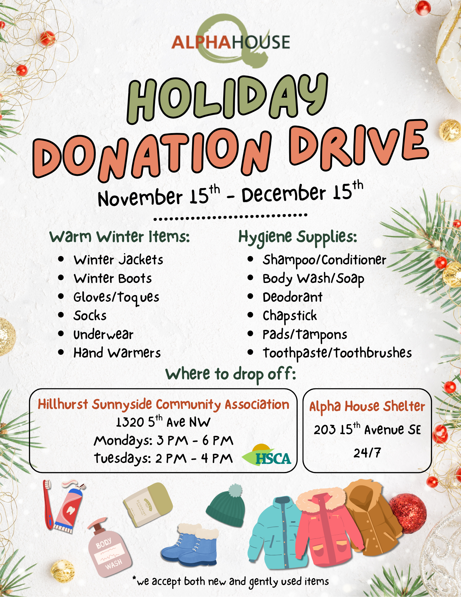 This holiday season, we’re teaming up with Alpha House to help share warmth, dignity, and care with neighbours who need it most. From November 15 to December 15, HSCA is collecting high-need winter and hygiene essentials that directly support individuals accessing Alpha House programs and shelter services.